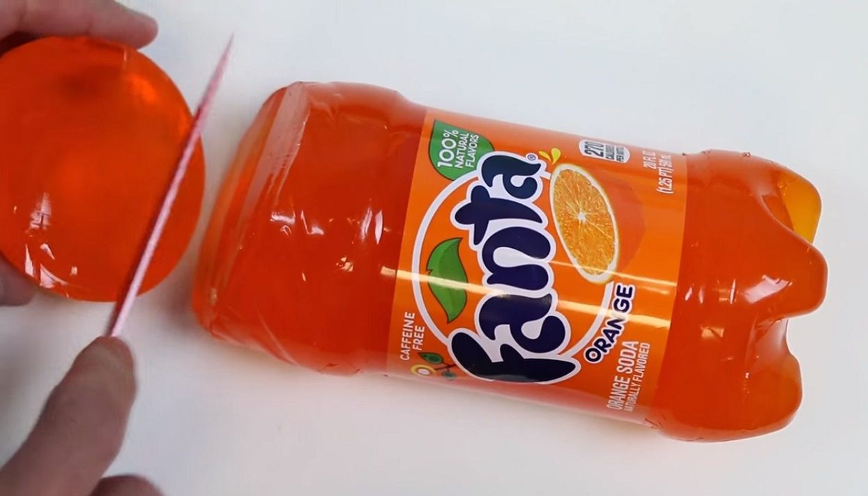 На видео, где готовят желе из «Фанты», бутылку подготовили заранее, сделав надрез на боковой стороне и заклеив его изолентой — так проще извлечь желе. Повар разбавил восемь пакетиков желатина небольшим количеством воды, перелил получившееся в миску с газировкой и все перемешал. Затем перелил жидкость в бутылку и отправил в морозилку.