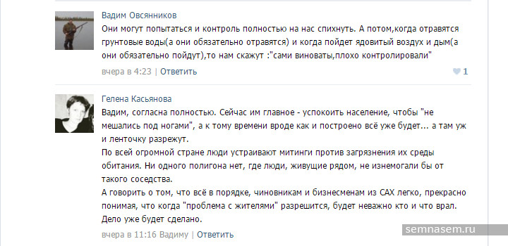 Жители Вахрушей уже проводили одиночные пикеты и собирали подписи против строительства. Сейчас в группе во «ВКонтакте» «Вахруши против мусорного полигона» состоит более тысячи человек. Жители массово отправляют письма в федеральные СМИ с просьбой обратить внимание на их проблему. Кировские чиновники еще в конце марта 2016 года призвали местное население смириться со строительством полигона.