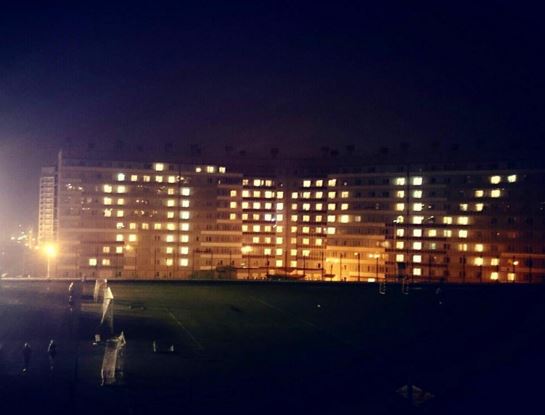 Студенты Красноярска приняли участие в акции «Зажги сердце города». Для этого они в общежитии СФУ одновременно зажгли свет в окнах в таком порядке, чтобы получилась надпись «Я❤ К».
