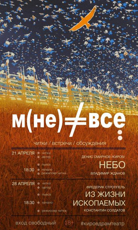 Друзья, 21 и 28 апреля в Кировском драматическом театре (ул.Московская - 37) стартует новый проект «Мне не всё равно» (читки, встречи, обсуждения) – проект для тех, кому не всё равно, что происходит в театре, и как он будет развиваться. Проект начнется с читок пьес в неожиданном для зрителей пространстве. В дальнейшем мы планируем расширить формат: проводить творческие встречи, лекции и дискуссии (предложения иных форм приветствуются). Приглашаем вас 21 апреля в 18.30 на читку пьесы кировского драматурга Дениса Смирнова «Небо.jpg» (режиссер читки – Владимир Жданов, актеры – Владимир Смирнов, Ольга Цивилёва, Иван Шевелёв, Елена Шевелёва, Захар Пантелеев) и 28 апреля в 18.30 на читку пьесы Фредерика Строппеля «Из жизни ископаемых» (режиссер читки – Константин Солдатов).