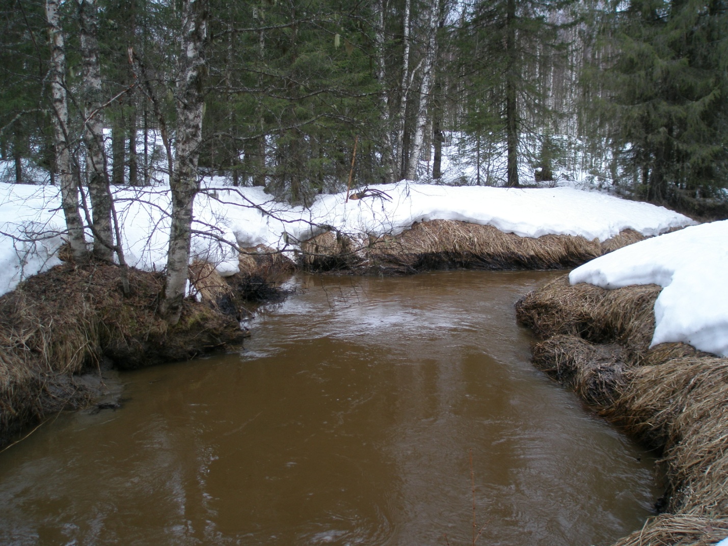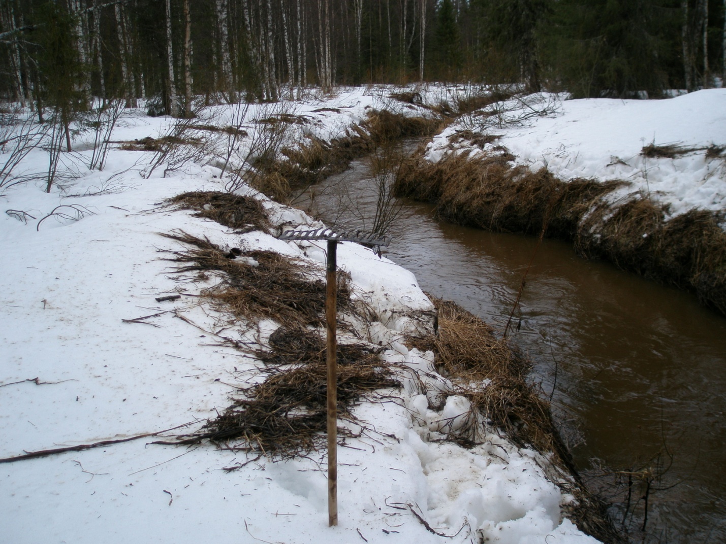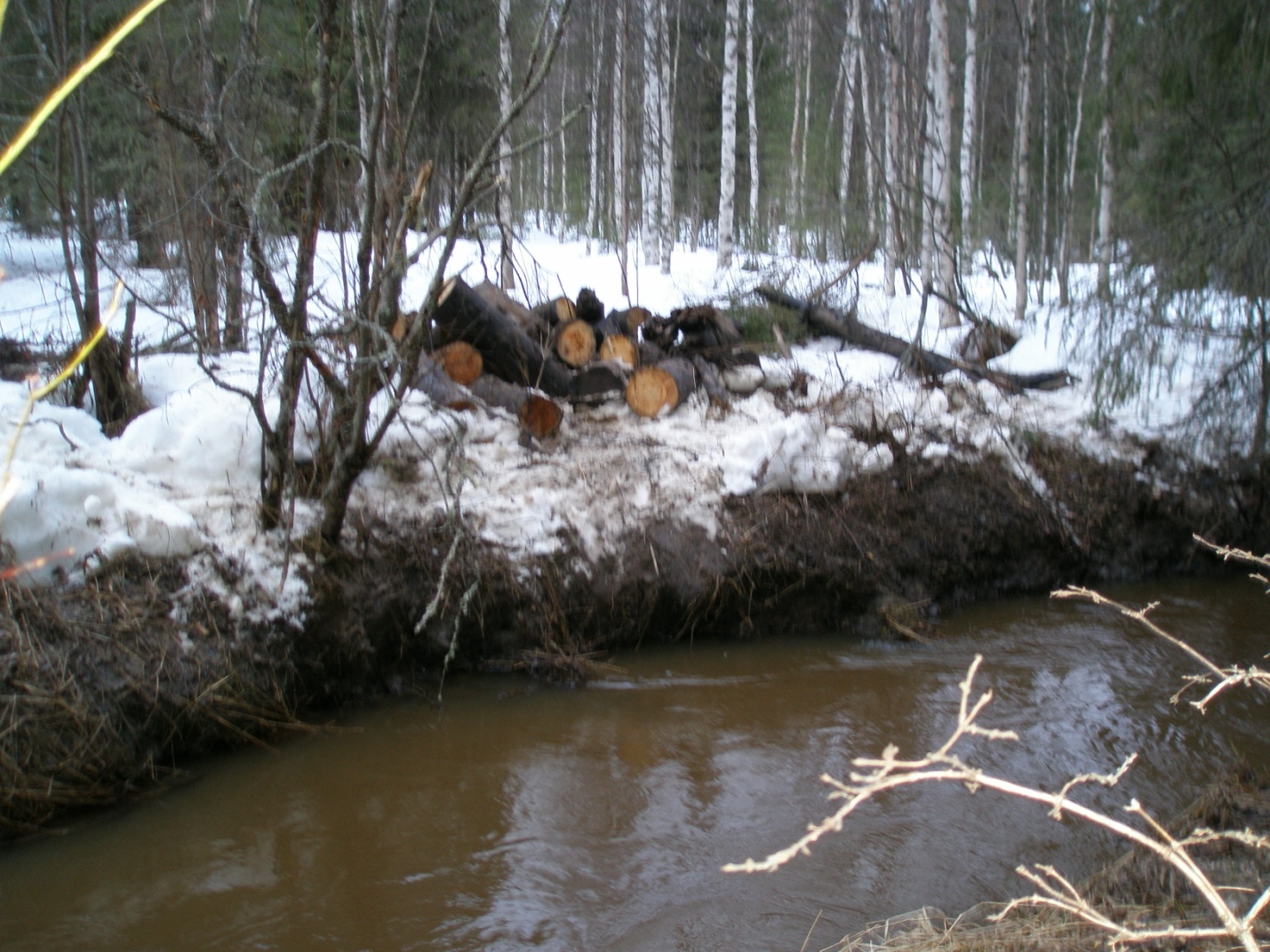 14 апреля 2016 года лесники обнаружили следы нефти на берегах ручья Малый Войвож, проходящего по территории строящегося промышленного комплекса, окольцованного автомобильной дорогой вдоль паропроводов. На Яндекс-картах все можно увидеть. 15 апреля на месте выхода ручья за пределы этой территории побывала комиссия с участием руководителя администрации МОГО "Ухта" и природоохранных служб. Сегодня, 19 апреля, на рассвете прошел по насту к этому месту и увидел следы работы бригады, накануне зачищающей проявления нефтепродуктов по берегам Малого Войвожа. Стволы деревьев, оказавшиеся на пути нефтесодержащего потока, бензопилой распиливали на отрезки и частично жгли в кострах. Замазученные кусты, ветви елей и прошлогодняя трава были сожжены в тех же кострах, а далее укладывались в кучи для последующего сжигания. Свисавшуюся к воде траву прочесывали обыкновенными граблями и укладывали на снег вдоль берегов. От дороги вниз по течению прошел около 400 м. Далее следы закончились, но лопаты и грабли стояли в снегу. Значит, работы будут продолжены. На поверхности ручья плывет радужная нефтесодержащая пленка.