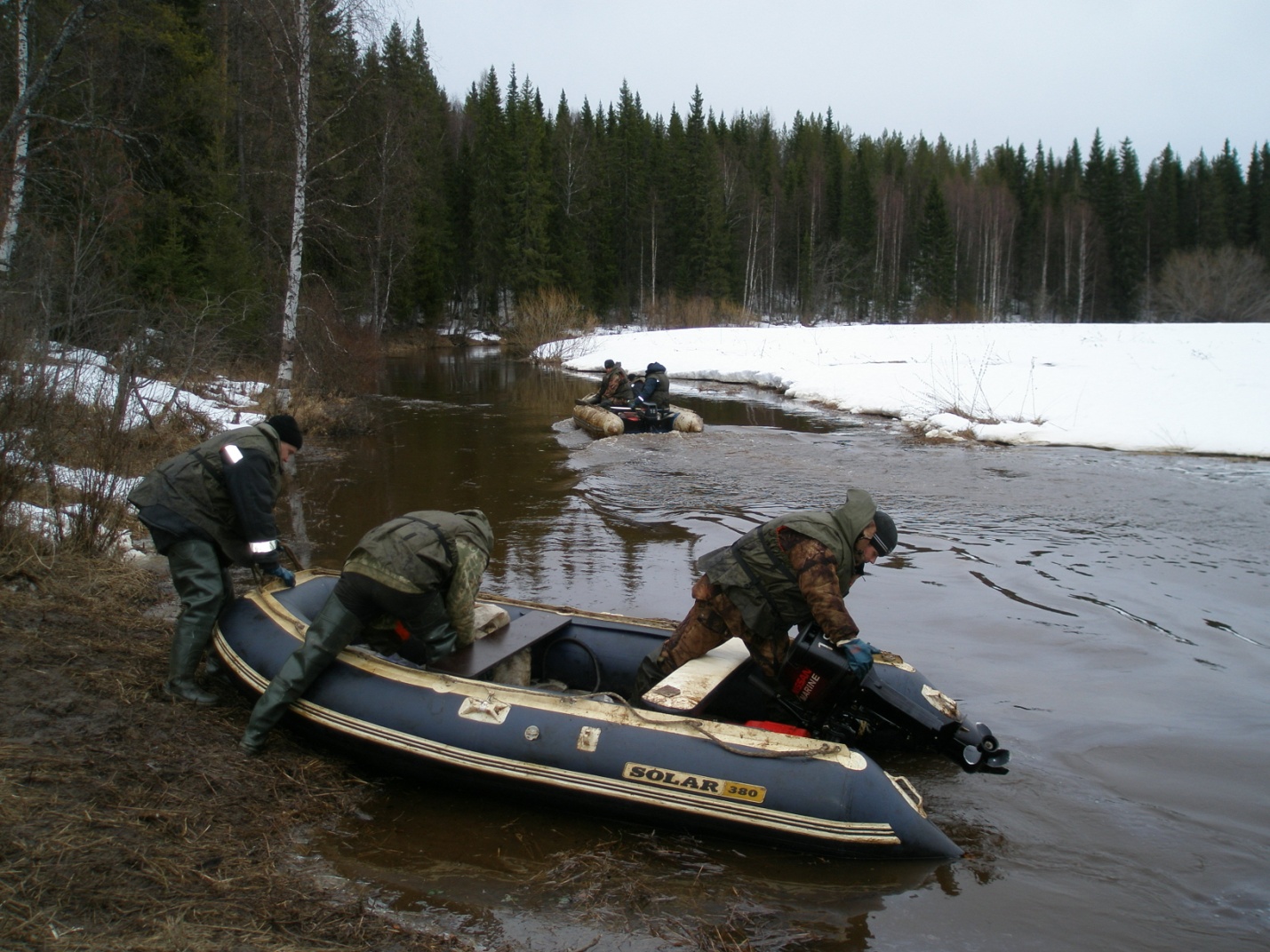 На обратном пути заехал к месту сбора нефтепродуктов у моста на реке Ярега. В приямке незначительное количество нефти, но на реке ее не видно – только радужная пленка. Готовятся к отплытию вверх по реке две надувные лодки с навесными моторами. На них производят сгон сгустков нефти, находящихся в кустах и в небольших заводях. Гидрозатвор для сбора нефти 15 апреля выглядел неэффективным, а 19 апреля и вовсе скрылся поднявшимся уровнем воды. Вахтовка с рабочими, собирающими нефть, встретилась на дороге при выезде от этого места.