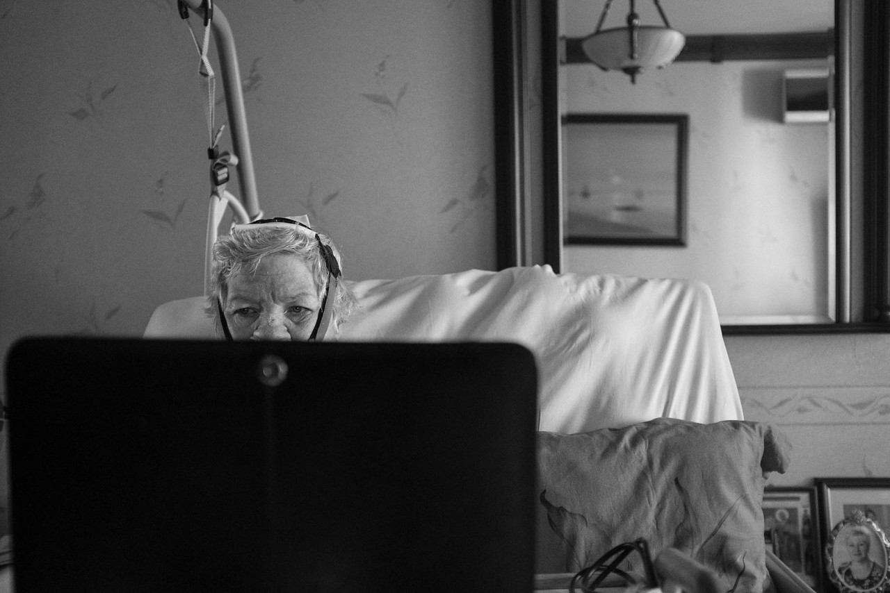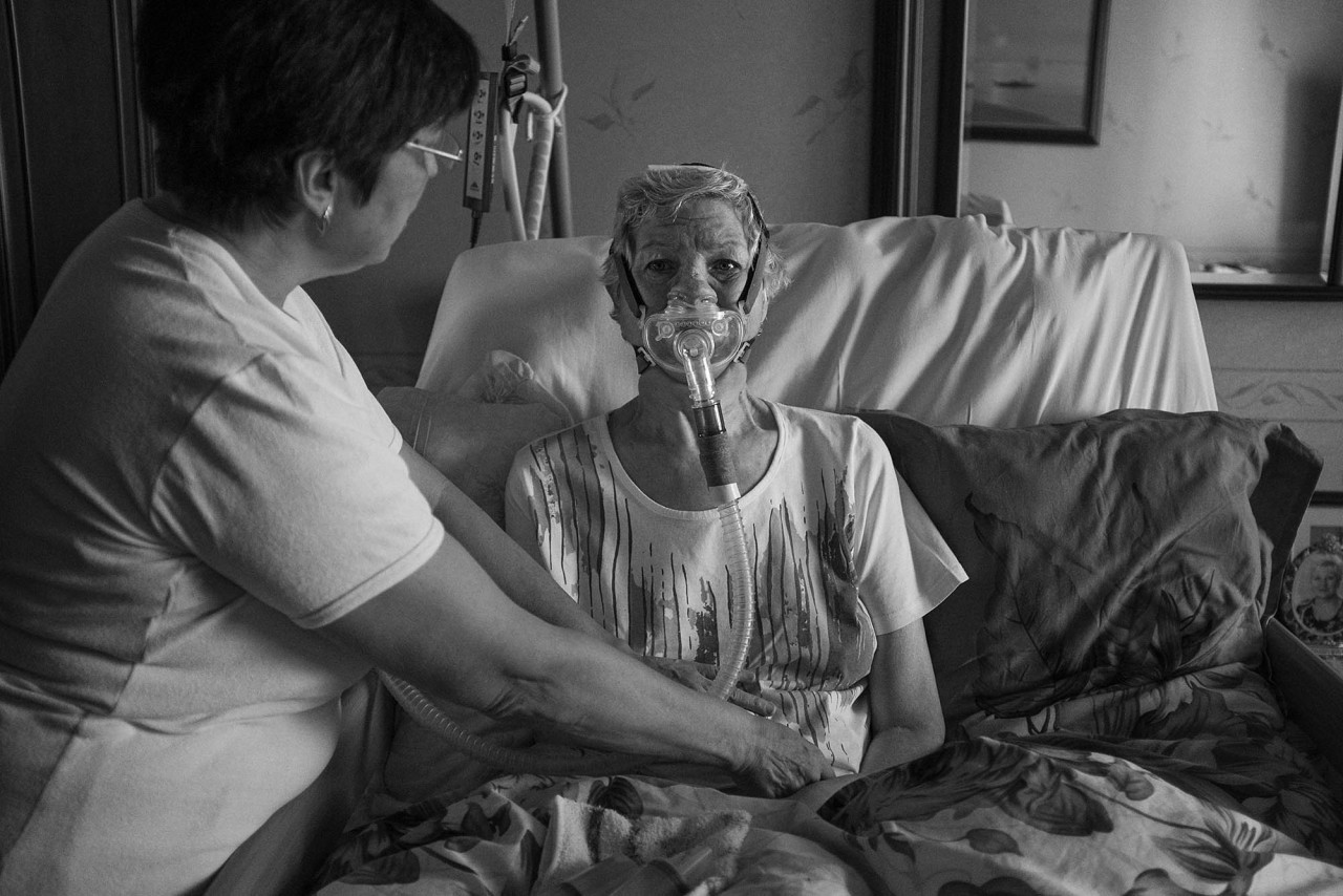 Три года назад Марии Васильевне стало тяжело дышать, тогда время от времени она стала дышать через маску с помощью дыхательного аппарата. Теперь она все время в ней. БАС поражает диафрагму — главную дыхательную мышцу, из-за этого легкие не расправляются до конца, а маска подает воздух в легкие под большим давлением и человек продолжает дышать. Дыхательный аппарат Марии Васильевны может также работать в режиме ИВЛ (инвазивной вентиляции легких). ИВЛ еще называют протезом легкого, он подключается не через маску, а через трахеостому, и может существенно продлить жизнь — могут отказать почти все органы, но с аппаратом ИВЛ человек продолжает жить. Мария Васильевна очень спокойно и здраво относится к своей болезни, она сознательно отказывается от подключения к дыхательному аппарату через трахеостому и к продлению жизни во что бы то ни стало.