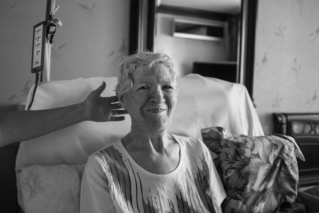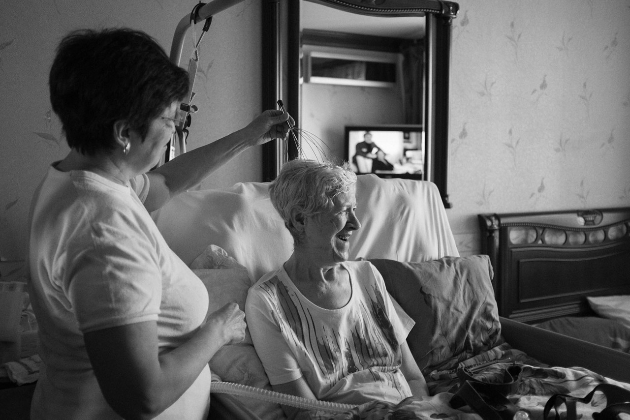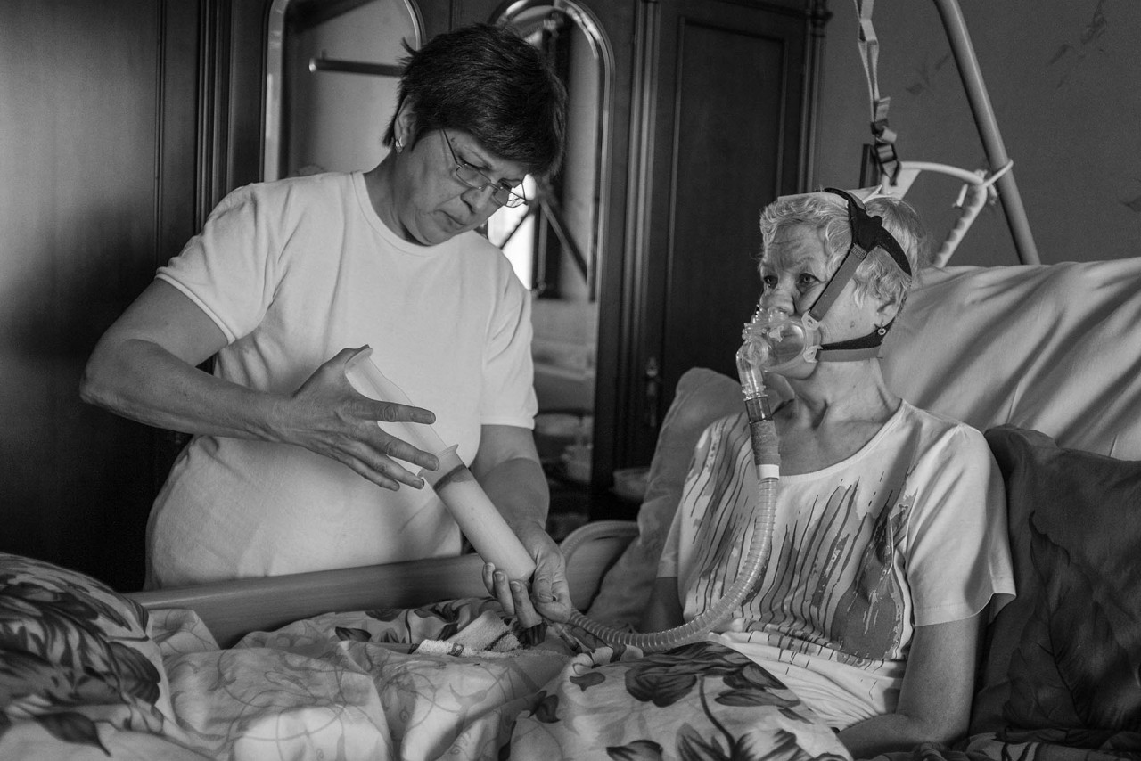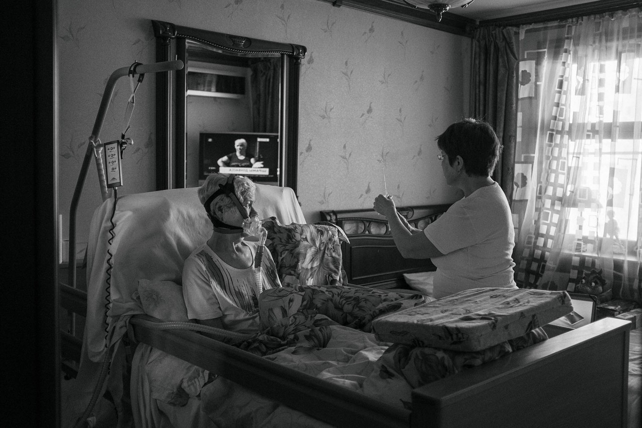 Год назад Мария Васильевна не смогла глотать сама, и ей поставили гастростому, теперь еду вводят через трубочку прямо в желудок. Чтобы облегчить одышку, ей колют морфин — этот препарат «отключает» в мозгу центр, который таким образом дает понять, что в организме скопилось слишком много углекислоты.