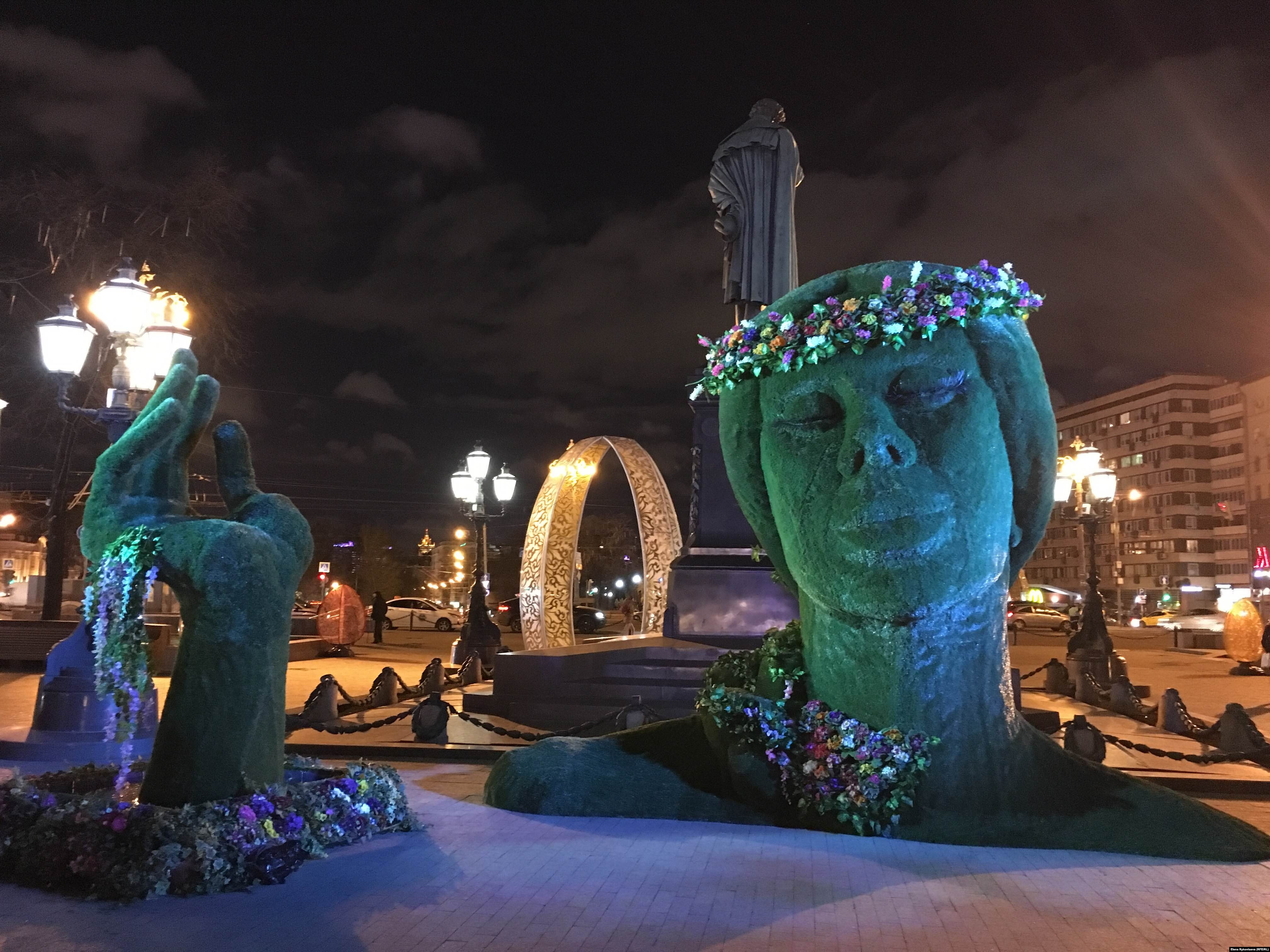 Елена Рыковцева: А еще сегодня выросла страшная зеленая голова возле памятника Пушкину. Наш корреспондент ходил по этим точкам, где появились новые объекты, и спрашивал прохожих, нравится ли им это.