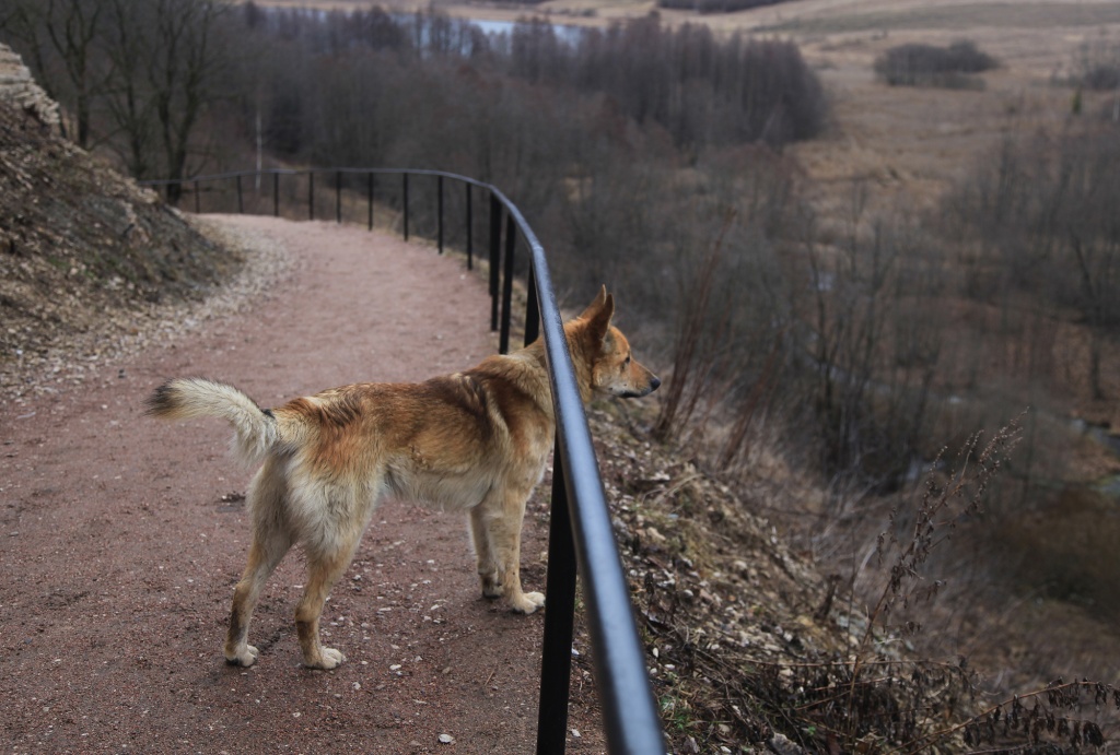 Рыжий крупный пес по кличке Изборск выполняет работу гида: в памятных местах и около природных смотровых площадок он останавливается и ждет, пока его подопечные туристы все сфотографируют