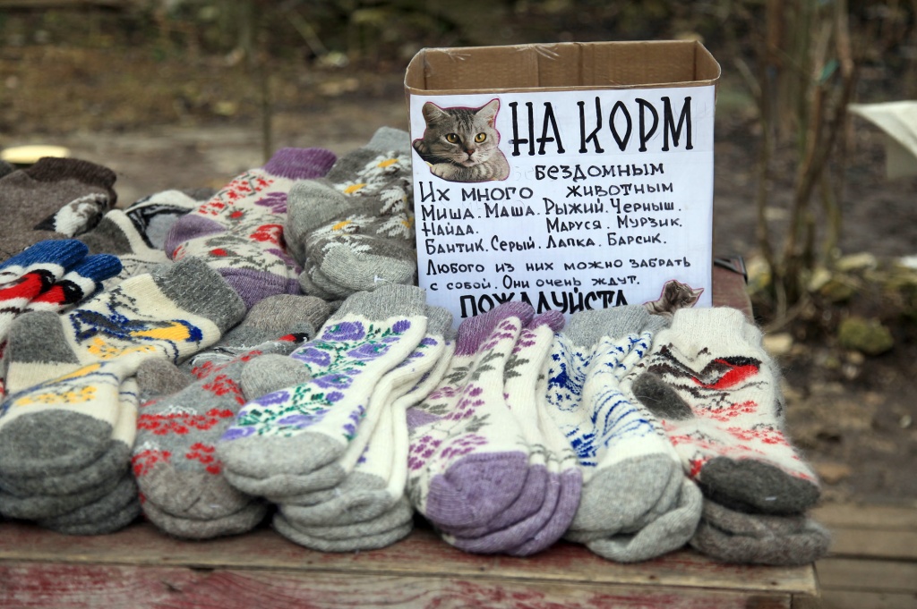 Прилавок у входа в крепость с призывом помочь многочисленным местным животным