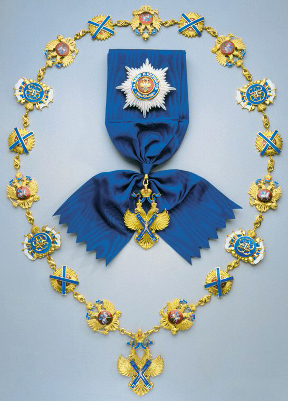 Знак, звезда, орденская цепь и орденская лента ордена Андрея Первозванного Российской Федерации. Он становится также гроссмейстером или главой этих орденов, но эту функцию он несет, только пока занимает должность. Когда он ее покидает, то он, тем не менее, пожизненно остается кавалером всех высших орденов. Президент Франции автоматически становится в момент инаугурации не только гроссмейстером орденов Почетного Легиона и Заслуг, но и кавалером их высших степеней. Премьер-министр Франции через два года пребывания в должности автоматически становится великим офицером ордена Почетного Легиона, т.е. кавалером II-й степени ордена. У нас такой традиции автоматического «вступления в кавалерство» вступающего в должность Президента или находящегося на должности Председателя Правительства нет. На мой взгляд, и с общефалеристической точки зрения, и с содержательной политической это не очень правильно, но это наша советская и постсоветская традиция. В соответствии с практикой, бывшие премьеры, как правило, получали орден «За заслуги перед Отечеством» I-й степени. Это относилось и к Черномырдину, который получил ее существенно позже оставления поста, и к Фрадкову, и к Зубкову, и даже к бывшему советскому премьеру Рыжкову. Не получил этот орден I-й степени Степашин, у него II-я степень, но он и пост премьера занимал очень недолгое время.