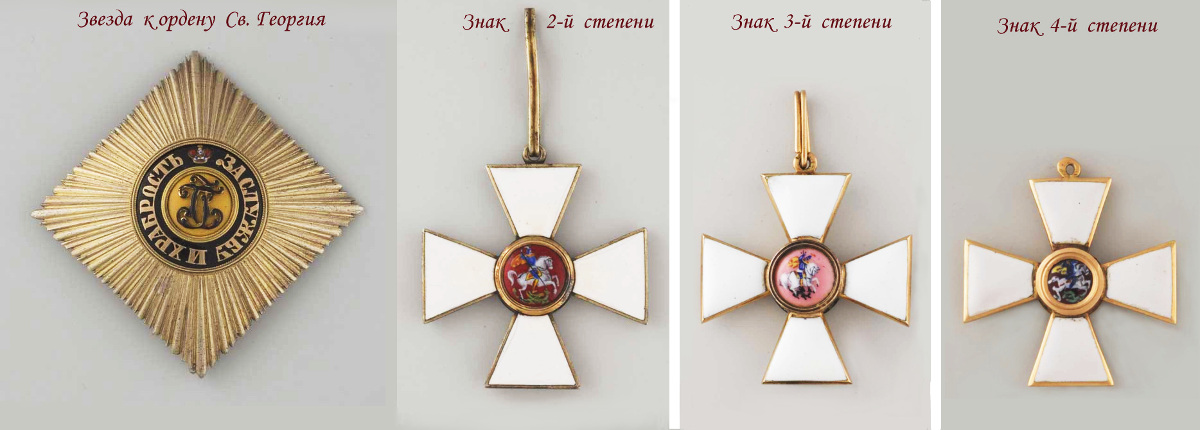 Звезда и знаки к ордену Св. Георгия Фото: commons.wikimedia.org Что касается кавалеров всех степеней ордена Св. Георгия, то их вообще за всю историю было всего четыре человека, и все они очень хорошо известны: это Кутузов, Барклай-де-Толли, Паскевич и Дибич — все фельдмаршалы и все, кстати, участники Отечественной войны 1812 года.