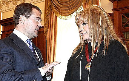 Д.А.Медведев и А.Б.Пугачева со знаком ордена «За заслуги перед Отечеством» III степени. Вручение награды. Рабочий кабинет Президента Российской Федерации. 2009 год. Фото: kremlin.ru