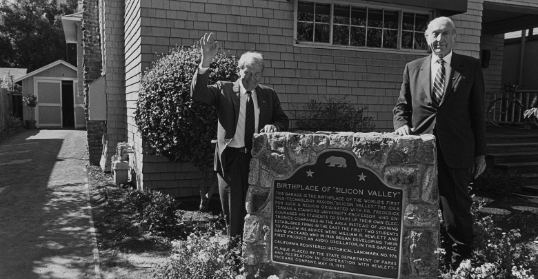 Уильям Хьюлетт и Дэвид Паккард, основатели Кремниевой долины, в своем первом офисе - гараже в Пало-Альто