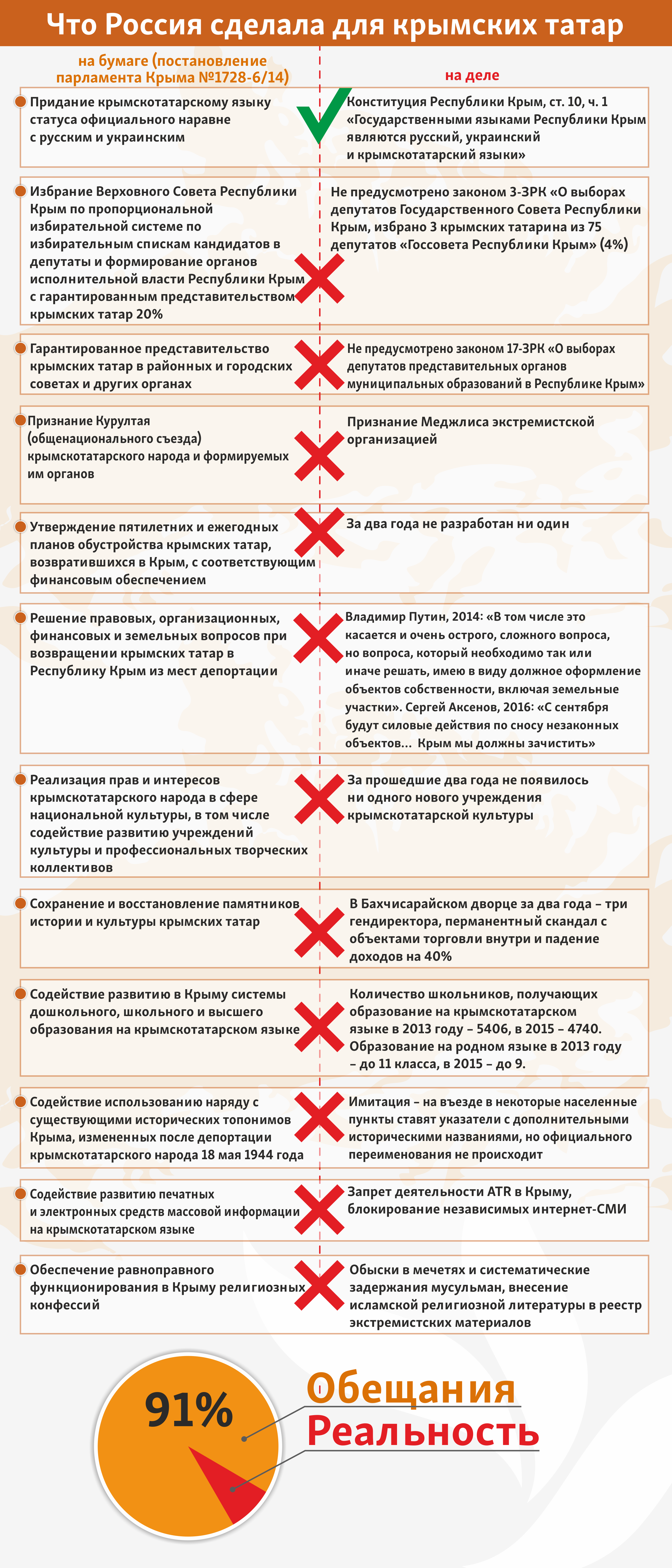 А дальше следуют 13 обещаний, степень исполнения которых мы увидим ниже. Квинтэссенция всех этих сладких посулов содержится в обращении президента Владимира Путина к представителям крымских татар в Кремле 16 мая того же года: «Мы готовы – и федеральные власти, и региональные, и, уверен, местные – мы готовы работать абсолютно со всеми людьми, которые искренне, хочу это подчеркнуть, стремятся к тому, чтобы людям стало жить лучше на своей родной земле».