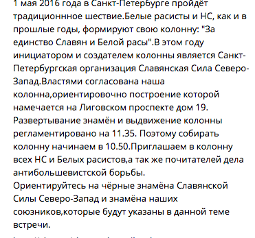 Представители движения «Славянская Сила Северо-Запада» сообщили на странице мероприятия «1 мая 2016.Колонна „За единство Славян“», что власти города согласовали их участие в первомайском шествии. В описании встречи также говорится о том, что Смольный одобрил проведение акции.