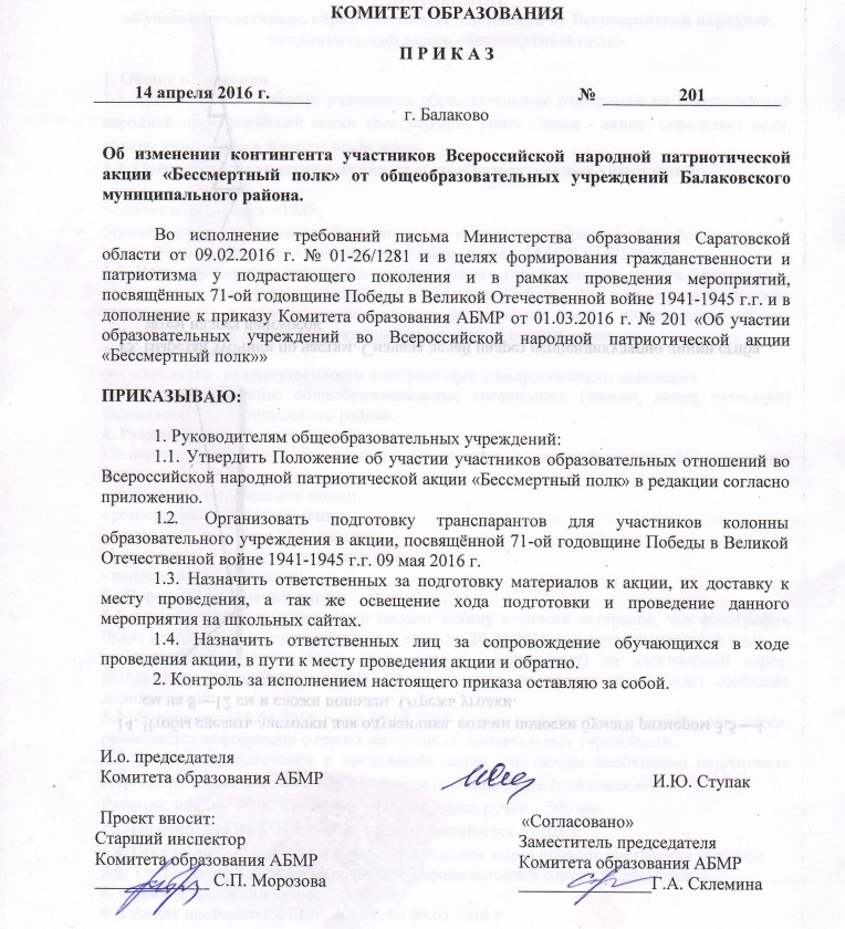 Приказ подписан и.о. председателя Комитета образования района Ю.А.Ступаком, который в свою очередь ссылается на требования письма Министерства образования Саратовской области 09.02.2016 года