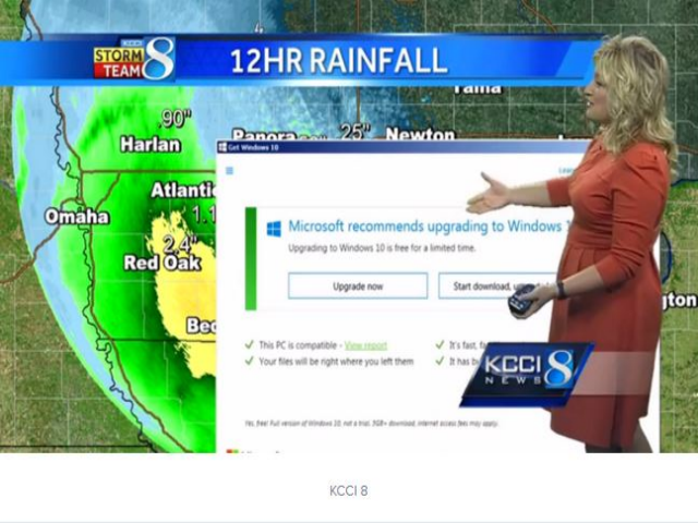 Ведущая прогноза погоду на телеканале KCCI 8 из Айовы столкнулась с надоедливым сообщением о готовности операционной системы Microsoft обновиться до следующей версии прямо во время утреннего выпуска новостей.