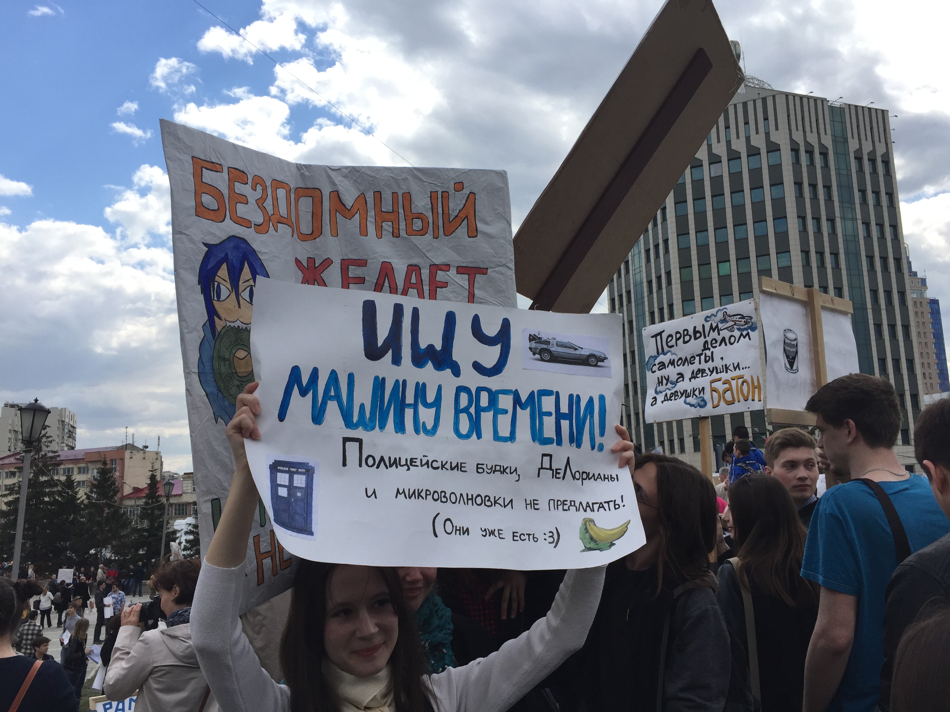 Сбор монстрантов был назначен на 13.00 по местному времени на площади у фонтана около театра "Глобус" в Новосибирске. В назначенное время площадь превратилась в территорию бессмыслицы. Уже в тринадцатый раз, несмотря на сопротивление властей, абсурдное шествие прошло по городу с плакатами, надписи на которых были, как всегда, одна нелепее другой: "Пастернак или как", "Ад переполнен, пришлось вернуться", "Вступайте в ряды долга", "Накорми меня бобром", "Ты совсем поехал или так, проездом", "Империя зла. Империя очень зла", "Кто защитит хорьков", "Ищу принца, как у белого коня", "Нет профайла – нет проблем", "Устроим цензуре темную".