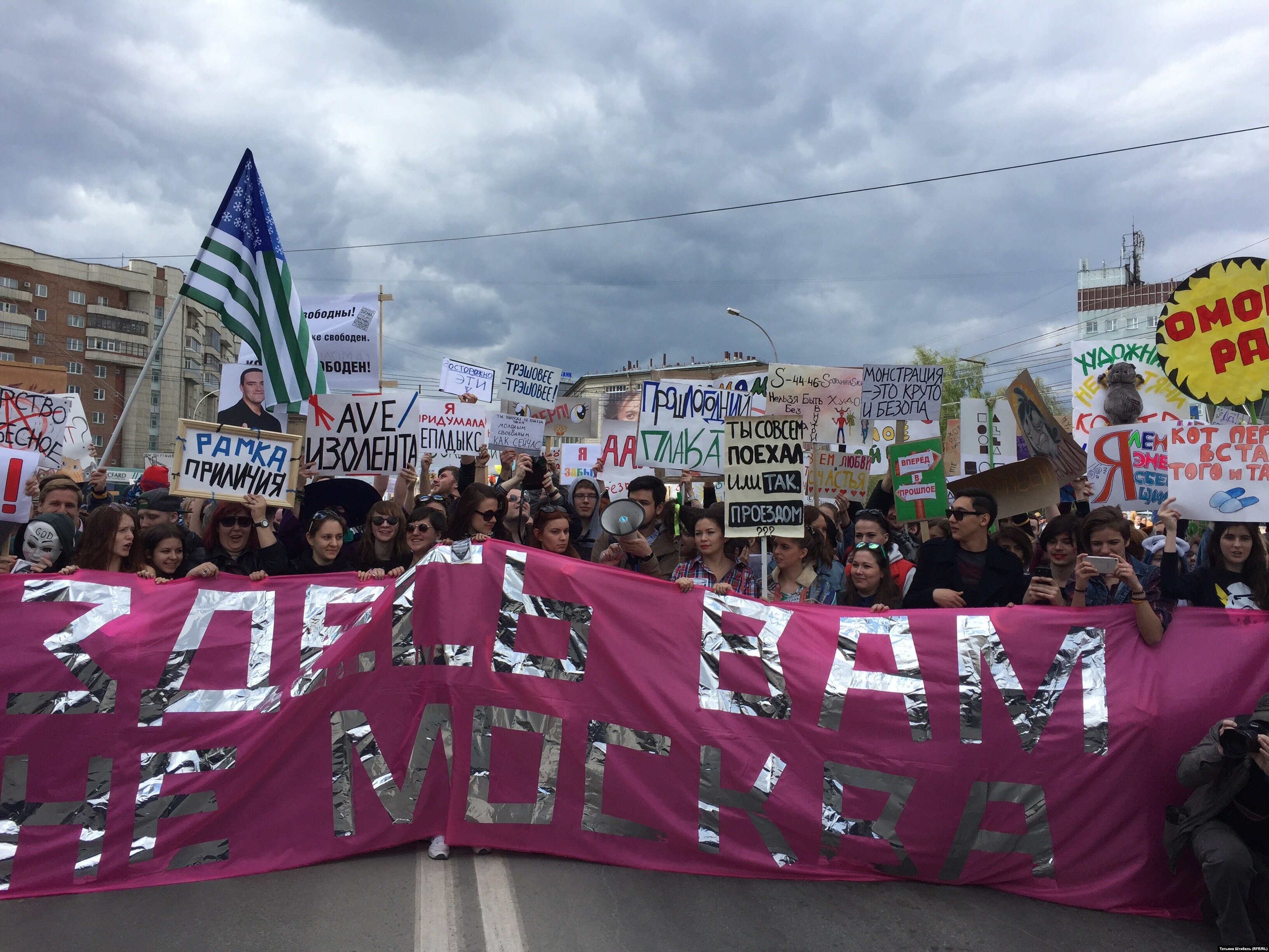 В назначенное время колонна монстрантов отправилась вслед за "Всешествием", развернув главный лозунг дня: "Здесь вам не Москва". Этими словами чиновники городской администрации объяснили накануне Артему Лоскутову причину очередного отказа в согласовании маршрута "Монстрации".