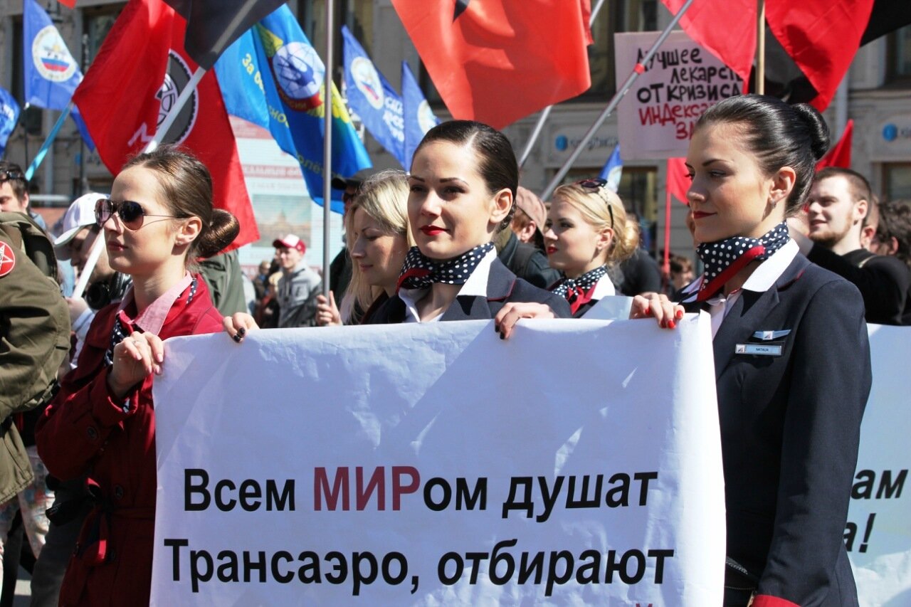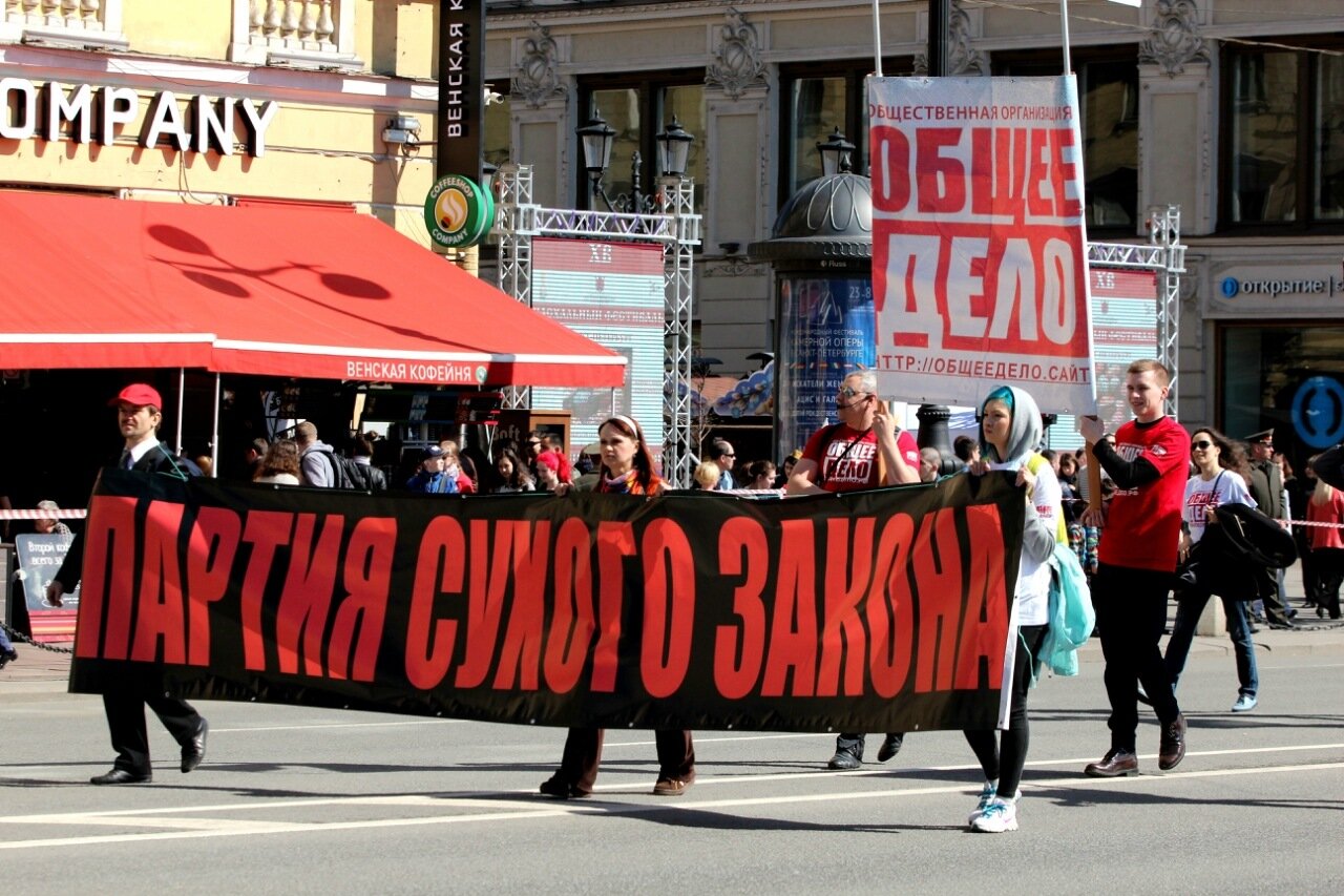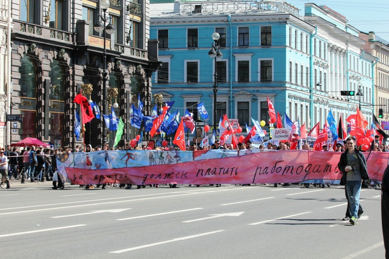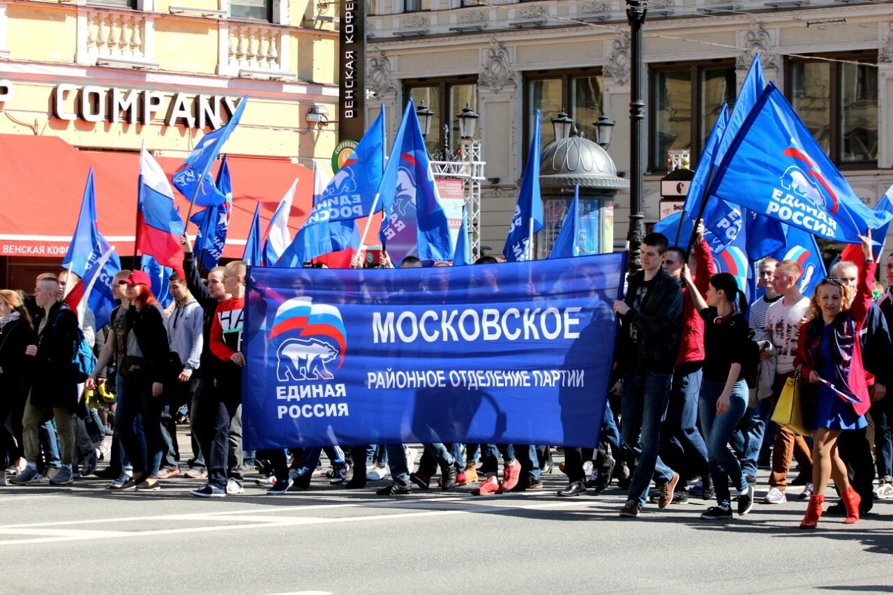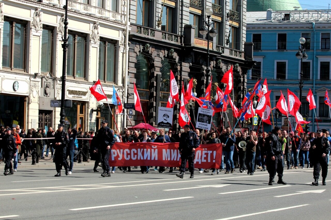1 мая 2016 г. провел на демонстрации, происходившей на Невском проспекте. Как всегда, колонны представляли разных социально-политических субъектов. Первая часть - это колонны лояльных власти профсоюзов с лозунгами о желательных социальных мерах со стороны государства, Здесь же колонны районов города. Это, судя по всему, служащие муниципальных органов, марширующие по долгу службы. И здесь же вперемежку в ними флаги и транспаранты "Единой России".