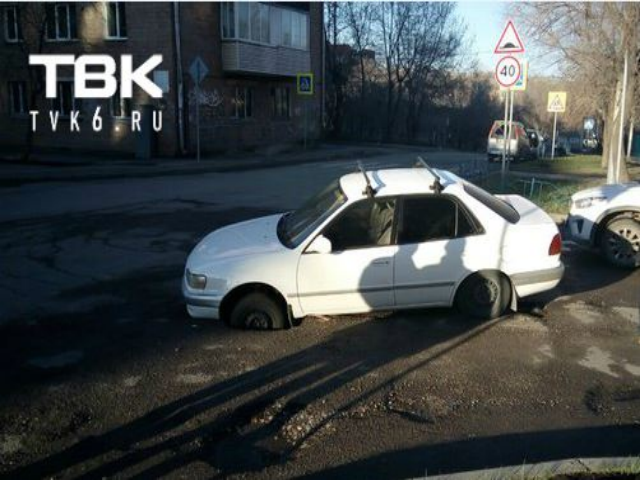 В Красноярске на ул. Толстого иномарка провалилась под асфальт.