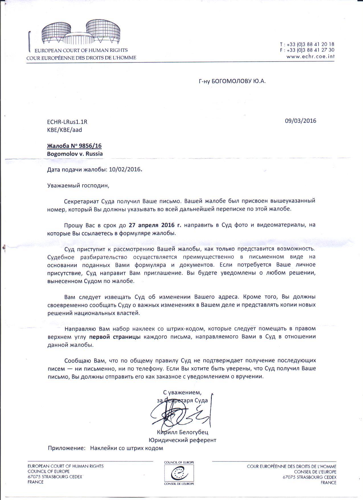Все руки не доходили сообщить. В общем, да, Европейский суд принял мою жалобу. Напомню, я стоял в одиночном пикете с плакатом в защиту от застройки парка Морской славы в Рязани. На плакате было написано: "Нам нужны парки, а не каменные джунгли". Полицейские составили протокол (по инициативе центра "Э", как я понимаю), а суды (их было два, через апелляцию) бездоказательно и в нарушение Конституции присудили мне штраф в 10 000 (десять тысяч) рублей. (После чего я обматерил принявших такое решение судей, и против меня уже завели уголовное дело за "оскорбление", апелляция по которому, кстати, пройдет сегодня в 16.30).