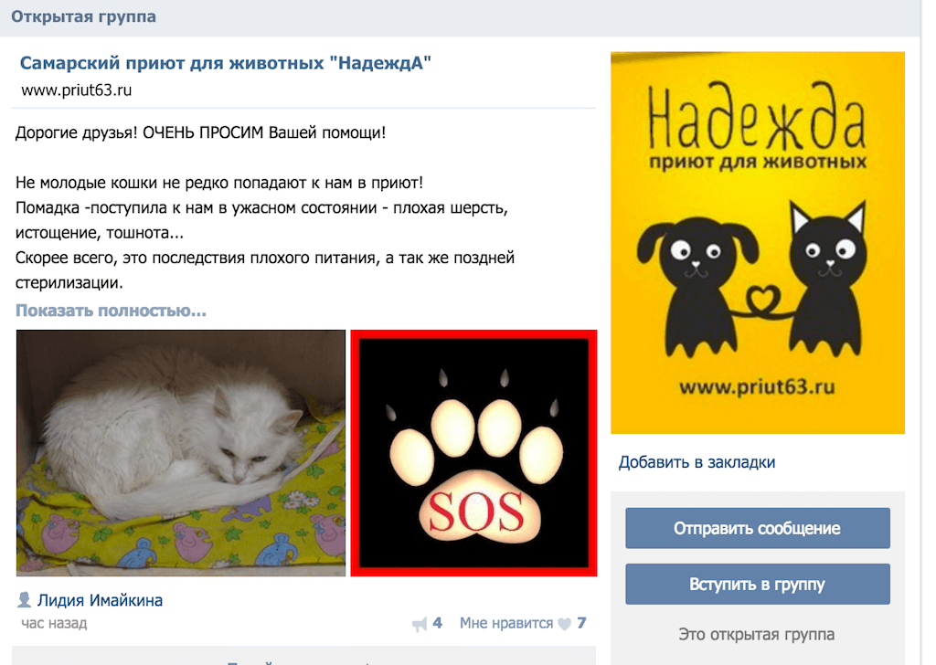 В сообществе приюта добровольцы оперативно размещают фотографии животных, запросы на сбор средств и отчеты об их расходовании. Жители Самары часто обращаются к администраторам за помощью для найденных животных, обсуждают сложности и особенности жизни со спасенными питомцами.