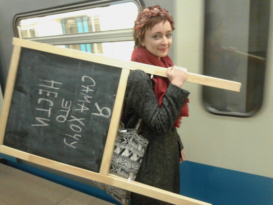 Мои действия с плакатом — импровизационные, они как-то учитывают ту реальность, в том числе художественную реальность, в которой мы находимся. Например, я однажды оказалась в вагоне с нищим, у которого тоже был плакат, такого же размера и тоже написанный черным маркером. Мы стояли друг напротив друга. И то пространство, которое родилось между нами… люди не знали, как реагировать: они смотрели то на нищего, то на меня. Возможно, им хотелось эти плакаты слить в единое целое: либо мы оба нищие, либо мы оба, например, акционисты. Но не получалось.