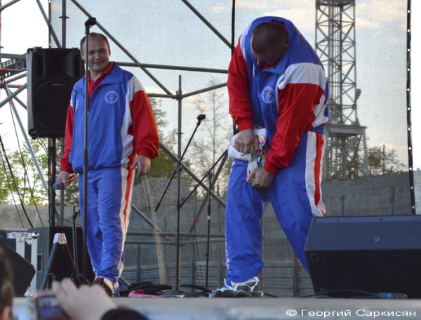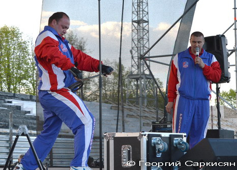 На следующий день - 8 мая, главный наш физкультурник Александр Муромский в течение минуты согнул об свою умную голову 12 стальных прутков.