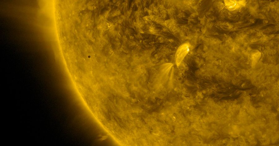 NASA Меркурий (черная точка) проходит по диску Солнца. Транзит Меркурия — редкое астрономическое явление, которое можно наблюдать только раз в несколько лет. Предыдущий транзит случился 10 лет назад, а в следующий раз Меркурий пройдет по диску Солнца в 2019 году.