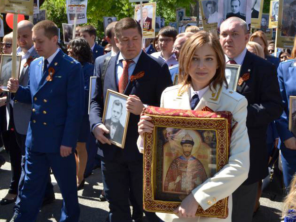 Наталья Поклонская с иконой Николая II. Сиферополь, 9 мая 2016 года. Фото: rkproc.ru Прокурор Крыма и один из символов присоединения полуострова к России Наталья Поклонская пронесла по Симферополю икону Николая II, который, по известным причинам, до начала Второй мировой войны не дожил. Журналистам она рассказала, что в прошлом году один из ветеранов рассказал ей, как во время войны ему с товарищем было видение царя Николая II, который помог ему спастись. И именно ветеран просил ее пронести изображение последнего императора во время акции «Бессмертный полк».