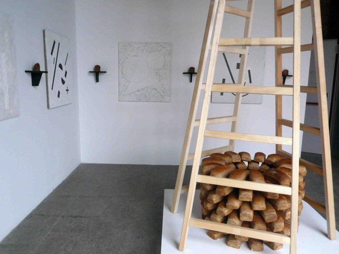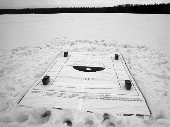 © Сергей Шутов Сергей Шутов. Apokatastasis Now. 2006 В 2004 году «Коллективные действия» устраивают абсурдистскую акцию «Полет на Сатурн»: слушая магнитофонную запись фантастического рассказа, художники «прибивают» план-схему из книги Андрея Монастырского (элемент в центре схемы отдаленно напоминает очертания Сатурна) к снежному холму с помощью буханок черного хлеба, в корки которых вставлены фотографии случайных персоналий из советской энциклопедии.