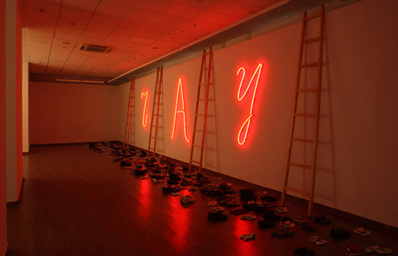 © conceptualism.letov.ru Коллективные действия. Стенд-газета. Акция. 2004 В конце нулевых бывшие участники «КД» — творческий тандем Игоря Макаревича и Елены Елагиной — обращаются к русскому космизму напрямую. В первую очередь, стоит вспомнить проект 2009 года «Общее дело» (название почти полностью дублирует заглавие сборника ключевых текстов Федорова, посмертно изданного стараниями его учеников; именно так, «философией общего дела», как известно, и стали впоследствии именовать федоровское учение). Это учение представляется Макаревичу и Елагиной метаутопией («Великой Утопией»), проектом проекта, соединившим в себе христианский мистицизм и материализм и потому оказавшимся чрезвычайно открытым для интерпретации. Работа «Общее дело» предполагала несколько инсталляций. Это, во-первых, «Печь с тремя лестницами» — трехгранная лестница, опорой которой служит русская печь. Во-вторых, «Небесная лестница и эфирный остров» — красный мухомор, символизирующий «окормление космоса», с установленным на нем макетом татлинского «Памятника III Интернационалу» (спиралевидный «интернационал» здесь служит небесной лестницей, а пятнистый галлюциногенный гриб — соответственно «эфирным островом»). По Федорову, такая лестница (или, выражаясь его языком, «лествица») символизирует развитие и восхождение человечества, а также соединяет небесное с земным в обоих смыслах — как божественное с человеческим, так и космическое с теллурическим. А «эфирный остров» — это определение, данное Циолковским для так называемой всей известной Вселенной, причем дано оно было вовсе не по причине избыточной нежности или стремления подчеркнуть эфемерный, призрачный («галлюциногенный») характер Вселенной и знания о ней. Трогательное словосочетание выступает здесь не метафорой, а оформленным результатом научной интуиции ученого-космиста. Эфир, полагал Циолковский, составляет материальную среду, которая окружает Вселенную и одновременно служит источником ее образования (так, эфирное состояние ученый считал первой стадией формирования Солнечной системы). За этими проектами последовала инсталляция «Неизвестные разумные силы», которую Макаревич и Елагина представили в 2010—2011 годах в Париже, а спустя два года и в Москве. Сюжет инсталляции основан на одной из дневниковых записей Циолковского. Майским вечером 1928-го ему было видение: в небе возникла комбинация из трех букв латинского алфавита rАy, которую ученый расшифровал как «рай» по фонетической близости. Именно эти электрические буквы стали ключевым элементом инсталляции.