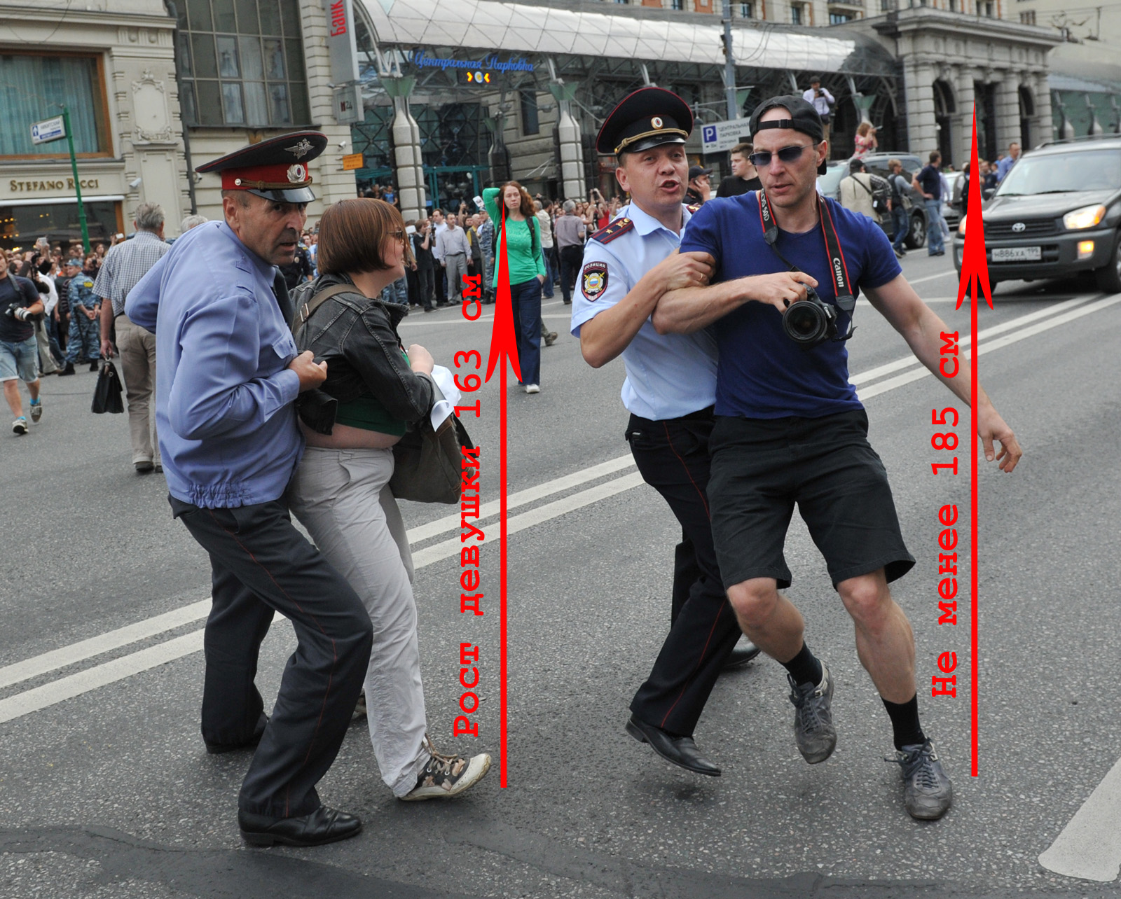 Рост женщины с этого кадра известен - 163 см. Рост Ахметова - 171 см. Рост "человека с Манежной" - не менее 185 см: