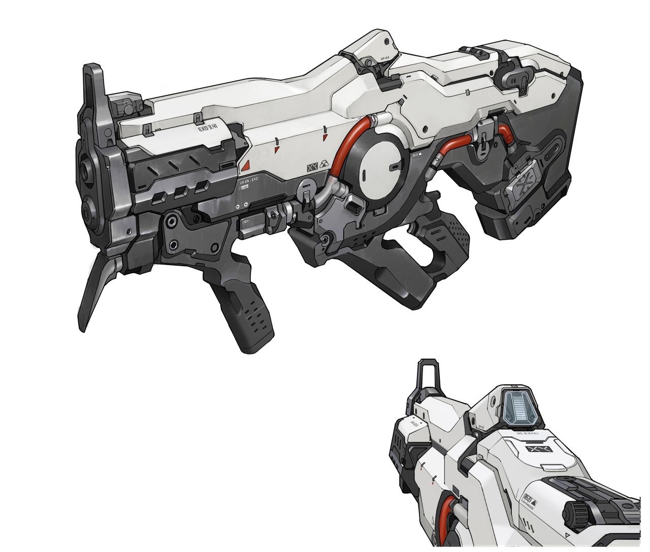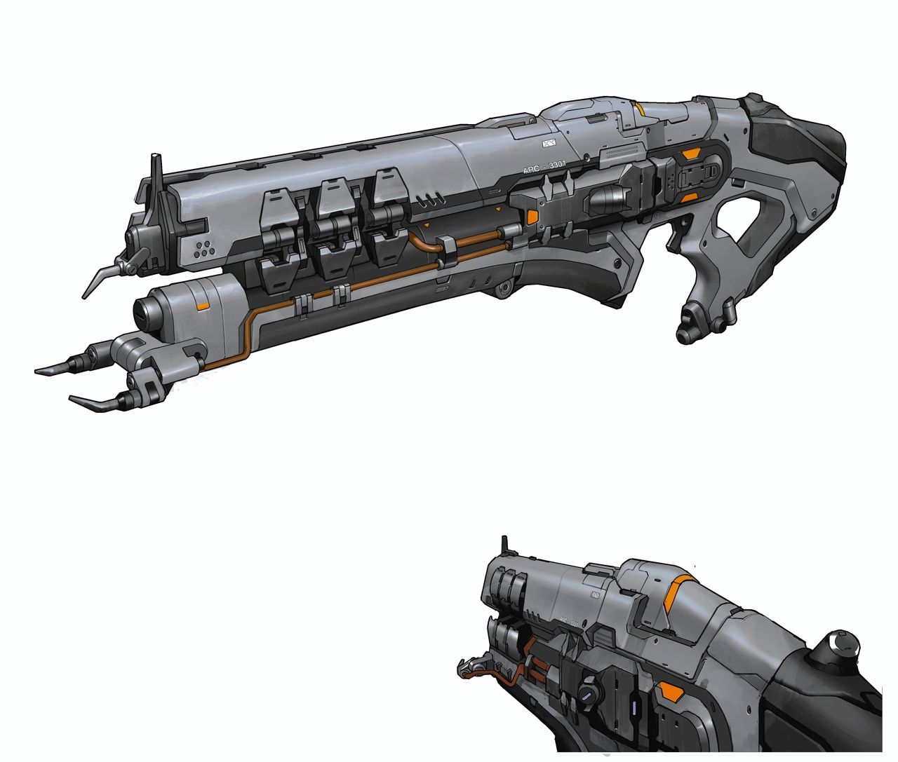Джон Лэйн: «У этого оружия два отдельных боевых режима. Когда используется второй режим, передняя часть винтовки раскрывается в более агрессивную стойку. Внешний вид электрической винтовки напоминает внешний вид живого существа — идея в том, что на некоторых технологиях корпорации UAC влияние ада отразилось заметнее».