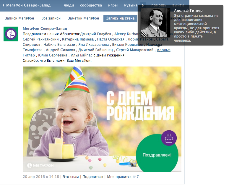 Аккаунт северо-западного филиала «Мегафона» случайно поздравил Адольфа Гитлера с днем рождения, назвав его при этом своим абонентом. Пост появился 20 апреля, в день рождения фюрера.