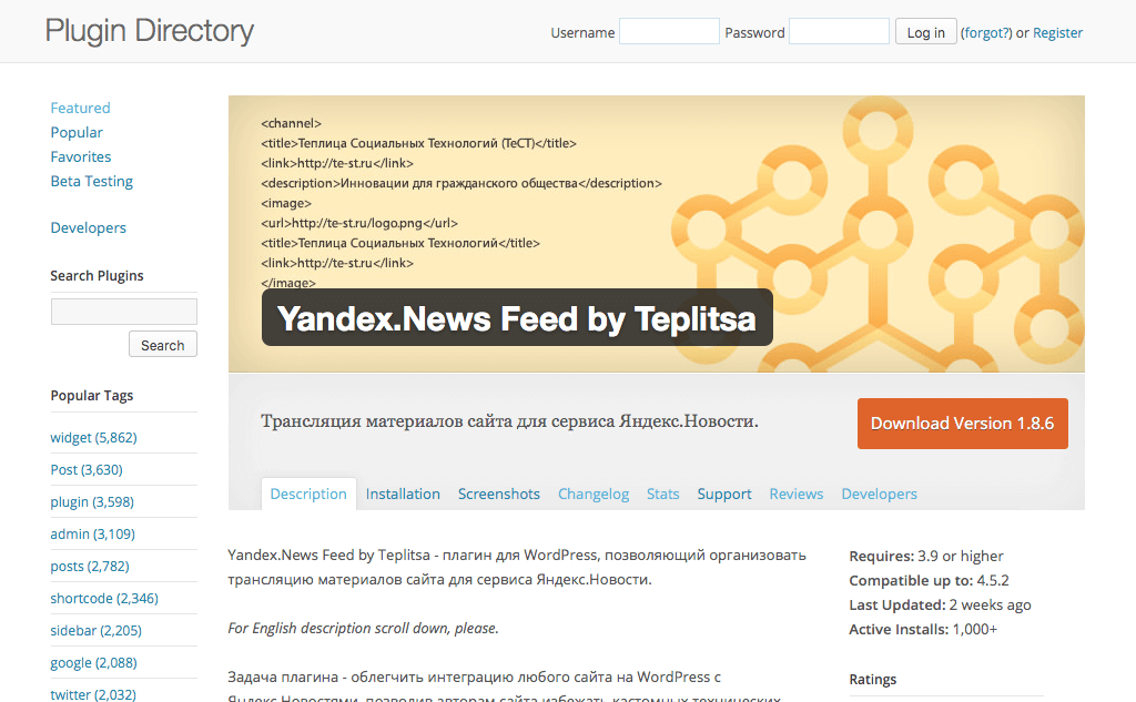 Дата11.05.2016АвторАнна ЛадошкинаИсточникТеплицаСохранённая копияInternet ArchiveOriginal MaterialShow translationПлагин Yandex.News Feed by Teplitsa Плагин для WordPress позволяет организовать трансляцию материалов сайта для сервиса Яндекс.Новости, облегчает интеграцию сайта. У плагина уже более восьми тысяч активных установок. В плагине уже встроена поддержка турбо-страниц. Подробнее о плагине.