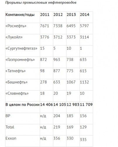 FLB: Российские нефтяные компании – мировые лидеры по утечке нефти. В 2014 г. у Total произошло 129 утечек, у ВР – 156, у Exxon – 335. В то же время в России «Роснефть» заявила о 5797 случаях прорыва промысловых трубопроводов. На втором месте «Лукойл» – 3114 случаев, на третьем «Башнефть» – 1132 аварии.