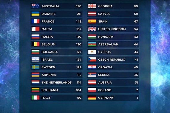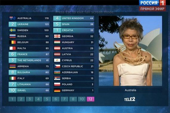 Ни одного балла Россия не дала Украине. Ни одного. Два балла лидеру голосования Австралии.