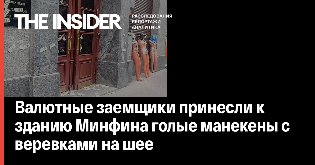 Валютные ипотечники провели акцию протеста — они принесли к зданию Министерства финансов голых манекенов с мешками на головах и веревками на шеях, передает RNS со ссылкой на пресс-секретаря Всероссийского движения валютных заемщиков Галину Григорьеву. На манекенах они разместили надписи «$0$, Минфин убивает».