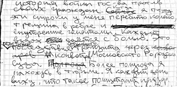 "Я поеду в Осло получать премию Вацлава Гавела, и Петр мне сегодня передает то, что он хочет, чтобы я со сцены сказала от него, и в конце дописка: "мне трудно дышать", – рассказала Радио Свобода Оксана Шалыгина. – Я смотрю на него, у меня глаза округляются, я говорю: "Это правда?" Он говорит: "Да". В Мосгорсуде происходит систематическое избиение арестантов и заключенных. Просто закидывают в автозак и избивают. Они швыряют их как кусок мяса. Дубинками, ногами, чем только можно, электрошокер в шею втыкают. И Петр попал под такой же замес. Его били 8 человек дубинками и руками. Врач осмотрел в СИЗО, но не зафиксировал побои. Лучше надавить на Мосгорсуд, в особенности на одного озверевшего человека: тогда, может быть, и другие заключенные перестанут эти побои получать. Мы будем сейчас активно добиваться, чтобы либо уволили этого человека, либо проверки к ним пошли".