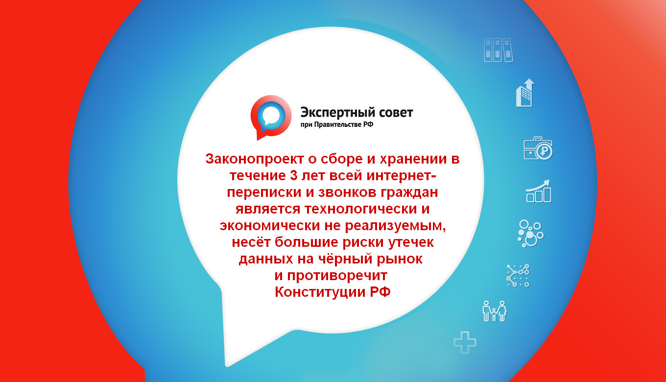 Рабочая группа «Связи и информационные технологии» Экспертного совета при Правительстве РФ подготовила заключение по результатам рассмотрения проекта федерального закона №1039149-6 «Об усилении мер по противодействию терроризму и обеспечению безопасности», который был рассмотрен Госдумой в 1 чтении 13 мая и предполагает в числе прочих норм обязательное хранение операторами связи и организаторами распространения информации на территории РФ в течение трёх лет информации о фактах приёма, передачи, доставки и (или) обработки голосовой информации и текстовых сообщений, включая их содержание. Также должны быть сохранены изображения, звуки или иные сообщения пользователей услугами связи. Они должны предоставляться уполномоченным государственным органам, осуществляющим оперативно-розыскную деятельность или обеспечение безопасности РФ.