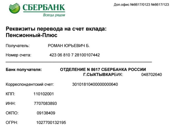 Банк получателя: ОТДЕЛЕНИЕ N 8617 СБЕРБАНКА РОССИИ Г.СЫКТЫВКАР