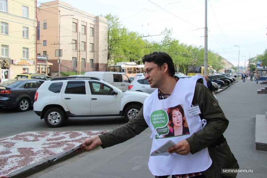 16 мая около полусотни петрозаводчан вышли на центральный проспект карельской столицы с требованием освободить «яблочницу» Светлану Чечиль из колонии. Участники одиночных пикетов раздали прохожим две тысячи листовок с информацией о деле Чечиль. По мнению протестующих, имел место несправедливый, заказной и политический характер судебного преследования.