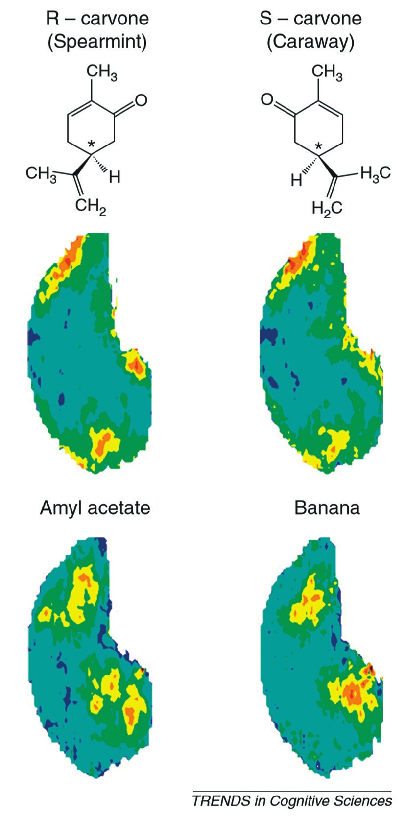 У человека меньше работающих генов обонятельных рецепторов, чем у других животных, зато очень неплохо идет от них обработка сигнала. Более-менее детальные принципы работы обонятельной системы стали понятны намного позже, чем механизмы других сенсорных систем. Нобелевские премии за расшифровку работы зрительного и слухового анализатора дали в 1920-е и 1930-е годы соответственно. А премию за расшифровку работы обоняния — только в 2004 году. Прочие виды ощущений кодируются не очень большим количеством физических стимулов: зрение — это электромагнитные волны, слух — механические колебания давления воздуха, здесь меняются лишь параметры (длина волны или амплитуда). С физической точки зрения это очень похожие вещи, они однообразны. Понятно, что можно сделать рецептор, который будет воспринимать подобную физическую модальность. А что делать с запахами? Запахов потенциально бесконечное количество, и каждая отдельная молекула — это новый стимул, который, как считалось, должен требовать отдельный рецептор. Очень долго было непонятно, как мы можем воспринимать такое огромное количество разнообразных молекул. Оказалось, у млекопитающих несколько процентов генома (очень много!) посвящены обонятельным рецепторам. Это около тысячи генов. Соответственно — тысяча рецепторов и огромное количество взаимодействий между ними (у человека, правда, работает немногим более трети этих генов, что не меняет общей картины). Именно в этих взаимодействиях спрятаны те миллионы запахов, которые мы потенциально могли бы распознать. Белки обонятельных рецепторов очень похожи на рецепторные белки, которые есть на поверхности других клеток нашего организма. Но, в отличие от других рецепторных белков, обонятельные рецепторы не очень избирательны по отношению к конкретной молекуле. Каждый рецептор воспринимает целый спектр похожих друг на друга молекул, причем спектры разных рецепторных белков перекрываются. Получается, что молекулы пахучего вещества, попадая на обонятельный эпителий, активируют не один, а сразу много разных рецепторных белков. Рецепторные белки находятся на поверхности обонятельных нейронов (их несколько десятков миллионов), а эти нейроны взаимодействуют с нейронами внутри обонятельных гломерул. И запах каждого отдельного вещества кодируется именно здесь, в одновременном срабатывании тысяч нейронов внутри гломерулы. Так что каждый запах обладает индивидуальным трехмерным узором активности гломерулолярных нейронов. Получается, по сложности распознавания каждый запах соответствует целому букету параметров, которые в зрительной коре головного мозга могли бы закодировать целое лицо.