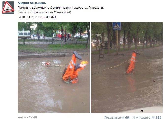 В Астрахани на улице Савушкина в яме на проезжей части местные жители установили памятник «павшим дорожным рабочим», сообщается в группе «Аварии Астрахани».