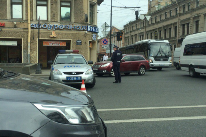 Часть Невского проспекта перекрыта, сообщают очевидцы. По словам пользователей соцсетей, собралась пробка.