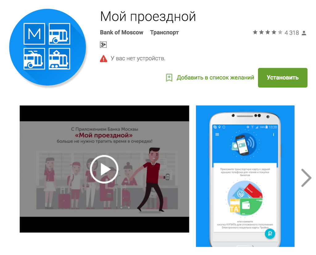 Приложение «Мой проездной» для держателей карт любого российского банка без комиссии, касс и очередей позволяет с помощью мобильного телефона, поддерживающего технологию NFC, купить любой билет на любой транспорт – наземный, подземный и пригородные электрички в Москве и Московской области – и записать его на транспортную карту «Тройка».