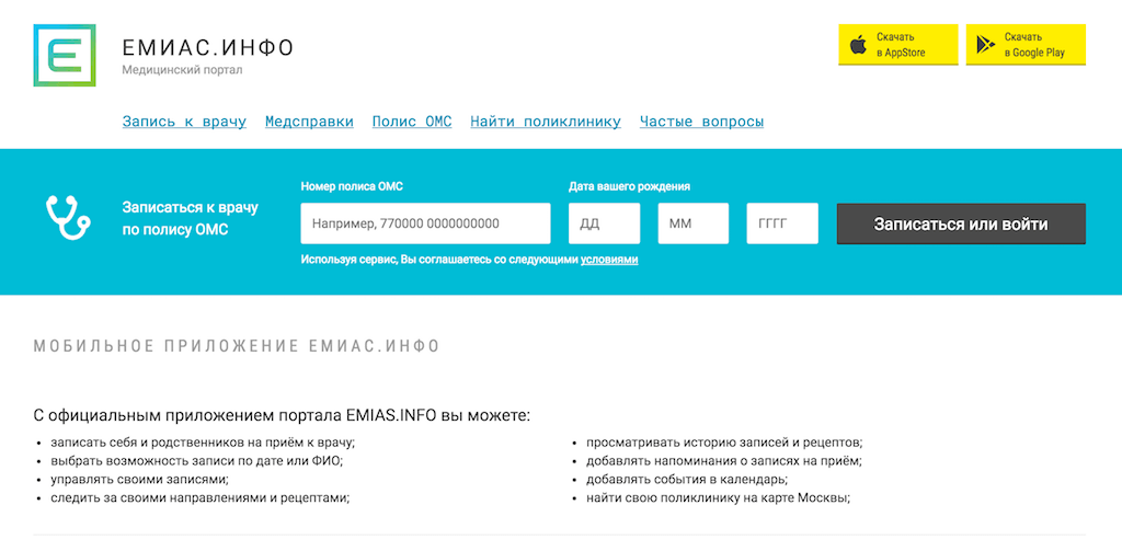 EMIAS.INFO (ЕМИАС – Единая медицинская информационно-аналитическая система) – это мобильное приложение для управления визитами к врачу, запущенное Департаментом информационных технологий Москвы.