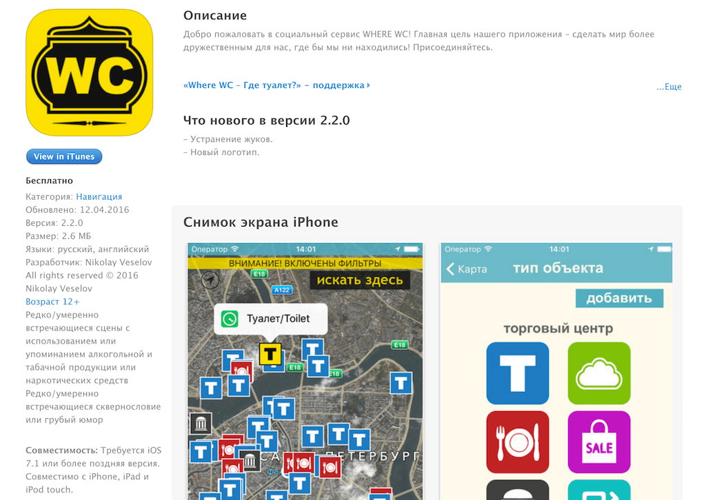 Where WC (Где туалет) – приложение, которое призвано сделать мир более дружественным для пользователей, где бы они ни находились. С помощью приложения пользователи могут найти общественный туалет в таких городах, как Москва и Санкт-Петербург. Приложение также можно дополнять, добавляя объекты в городах, в которых вы находитесь.
