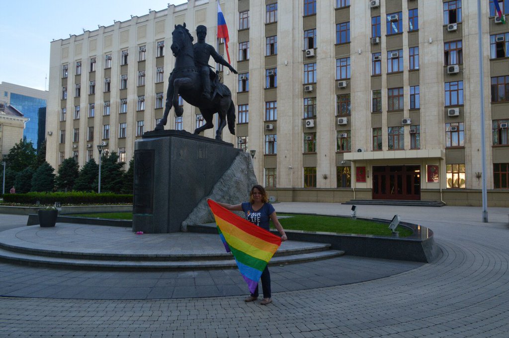 Позже возле краевой администрации прошел одиночный пикет с радужным флагом.