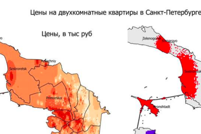 Доцент НИУ ВШЭ Анна Желнина составила карту недвижимости Петербурга с оценкой стоимости двухкомнатных квартир. Согласно данным карты, самое дорогое жилье находится в Кронштадте, Василеостровском районе, в Центральном и недалеко от Сестрорецка. Карты составлены на основе информации сайта «Бюллетень недвижимости». Еще одна карта фиксирует городские территории с наиболее дешевыми и дорогими квартирами. Так, в Пушкинском и Колпинском районах находится много недвижимости с низкой стоимостью, а в Центральном, Адмиралтейском, Петроградском и Василеостровском районах самые высокие цены на жилье.